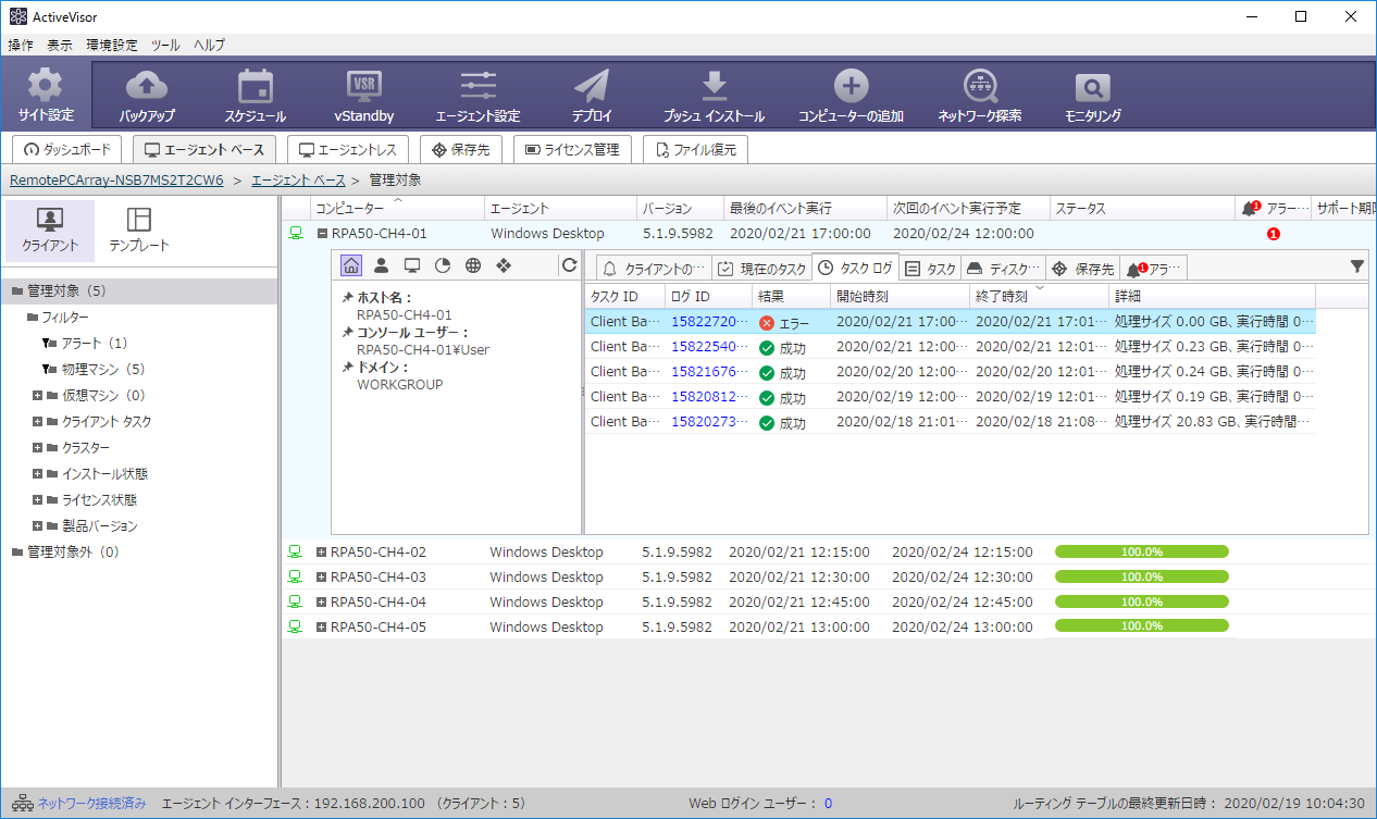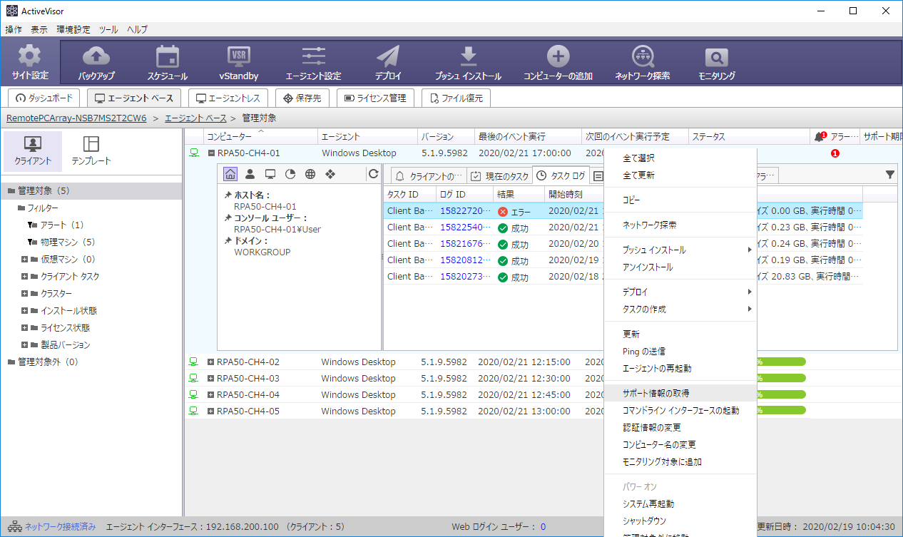 [アラート]でエラーが出ているクライアントを把握でき、[タスクログ]にてログの内容を確認してエラーの内容を確認できます。さらにログやWindows イベントログなどの情報が確認できる[サポート情報]が【ActiveVisor –RE】から取得することも可能です。
