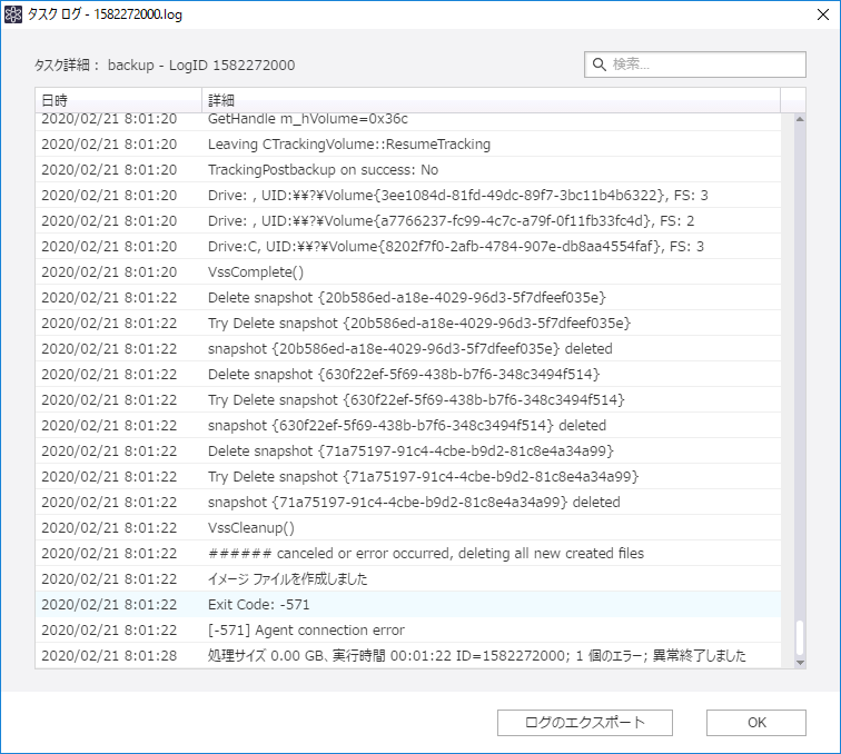 ※ [Exit Code -571]はエージェントに接続できなかったときのエラーで、今回はエージェントを停止した状態だったため、バックアップが作成できませんでした。