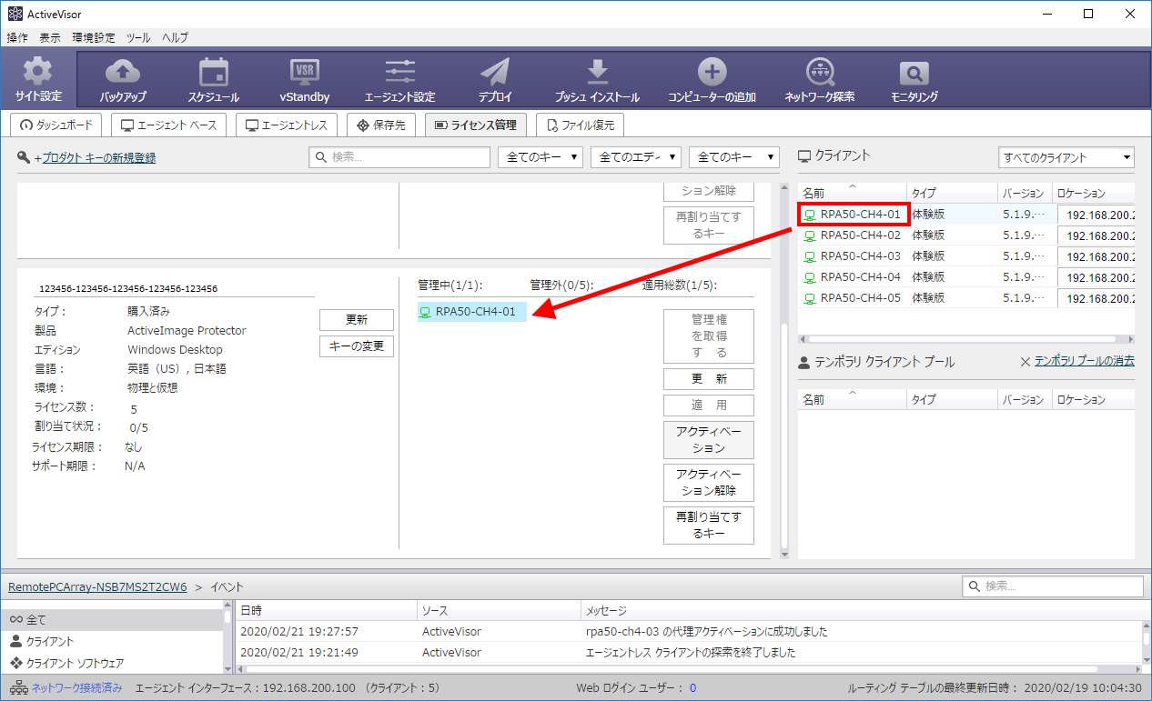 [クライアント]一覧からクライアントを適用するプロダクトキーへドラッグアンドドロップし、[適用]ボタンをクリックすることで、プロダクトキーの適用が行えます。
